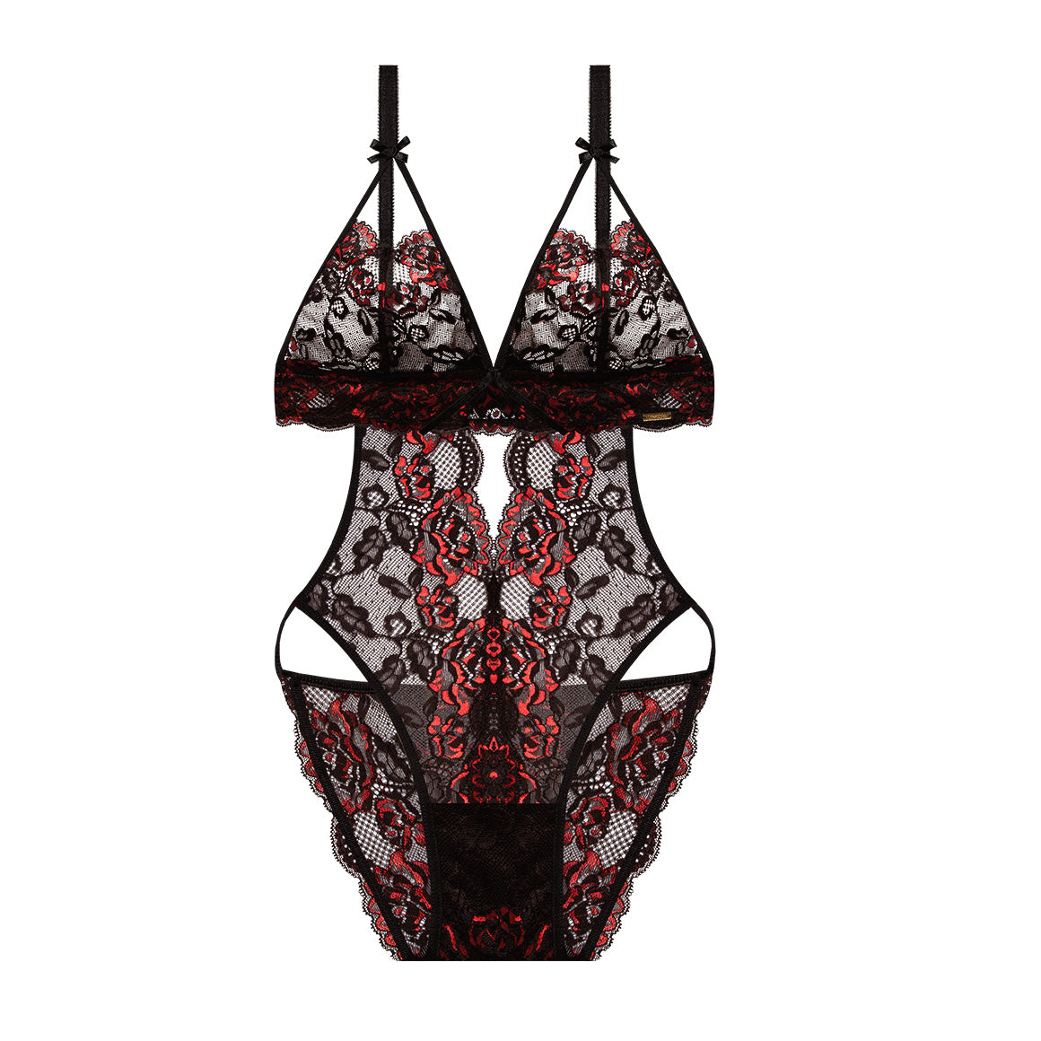 Teddy sin aros. tirantes decorados con elástico decorativo desde las copas hasta los mismos y regulables que se pueden cruzar en x en la espalda. banda angosta con broche de dos ganchos y cuatro niveles de ajuste. cobertura tipo panty con detalle de elásticos a los lados. elaborado de encaje. puente inferior de algodón.