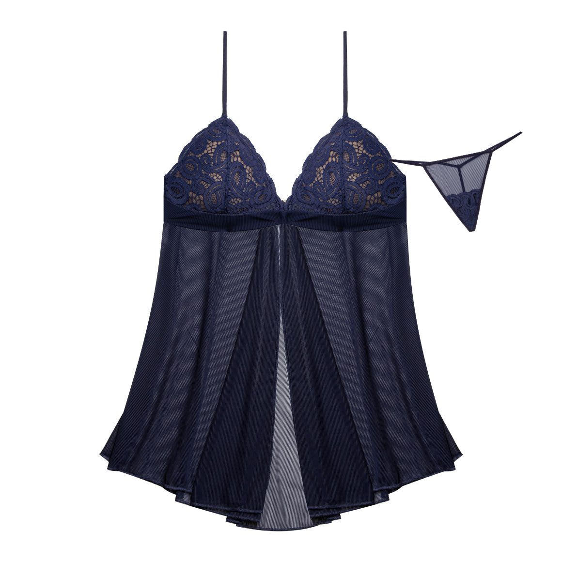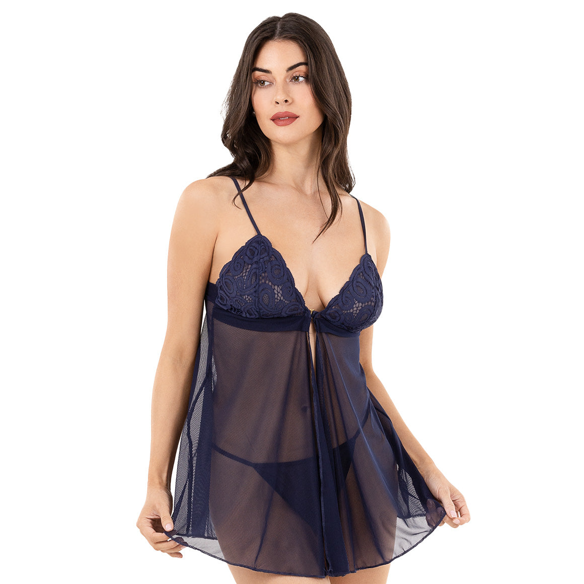Baby doll con corte imperio. broche frontal y tirantes regulables. elaborado de tull en la parte inferior y encaje en copas. *incluye hilo, elaborado de tull, encaje en la parte frontal y elástico en el contorno. puente inferior de algodón.