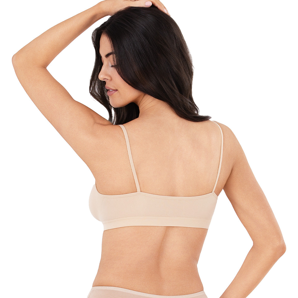 Brasier sin aro, de banda angosta, sin costuras laterales ni broche. con tirantes fijos. elaborado de microfibra, con detalle de encaje en escote.
