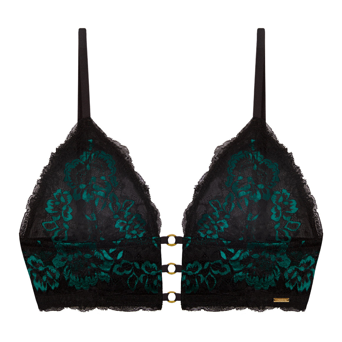 Bralette sin aros, copas triangulares y detalle de separación en el centro. banda angosta con elástico en las orillas para un mejor ajuste. broche de tres ganchos y cuatro niveles de ajuste. tirantes regulables. elaborado de encaje con refuerzo de tricot en copas.