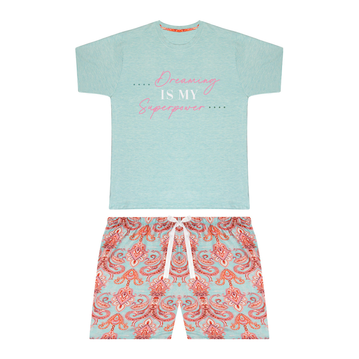 Pijama de dos piezas creada para ofrecer comodidad y un estilo relajado. elaborado en tela poliéster suave y ligero, brinda una sensación agradable sobre la piel. la blusa de cuello redondo con mangas y el pantalón corto (short) con cintura elástica se ajustan cómodamente al cuerpo, permitiendo libertad de movimiento. ideal para descansar, dormir o disfrutar de momentos de relax en casa con total confort.