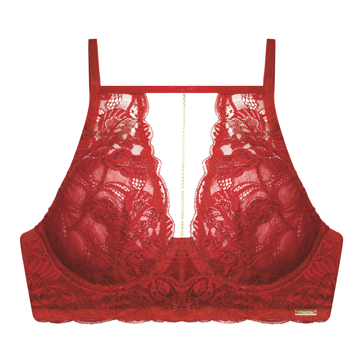 Bralette tipo halter con aros. banda media con elástico en las orillas para un mejor ajuste. tirantes regulables. broche de tres ganchos y cuatro niveles de ajuste. elaborado de encaje donde sube hasta el cuello para unirse a los tirantes dejando un pequeño escote en el centro con detalle de una cadena (no removible), refuerzo de tricot en copa y parte frontal.
