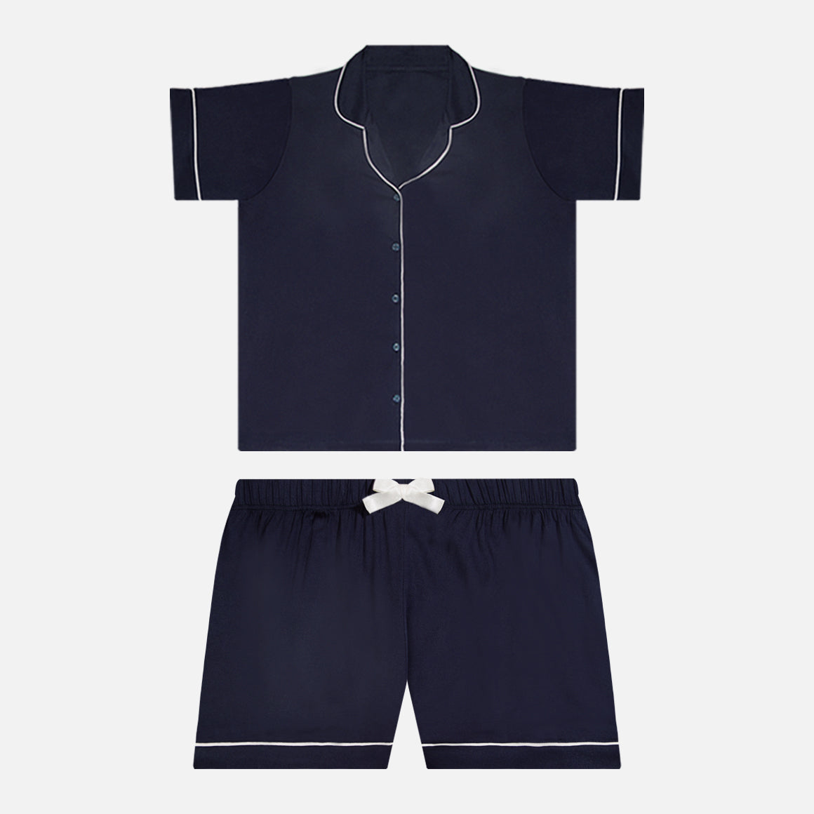 Pijama de dos piezas, elaborado con tela de dacrón suave. blusa con mangas detalle de cinta decorativa en ruedo y en el contorno del cuello y cierre de botones enfrente. pantalón corto (short) con detalle de cinta decorativa en ruedo y cintura elástica para un mejor ajuste.