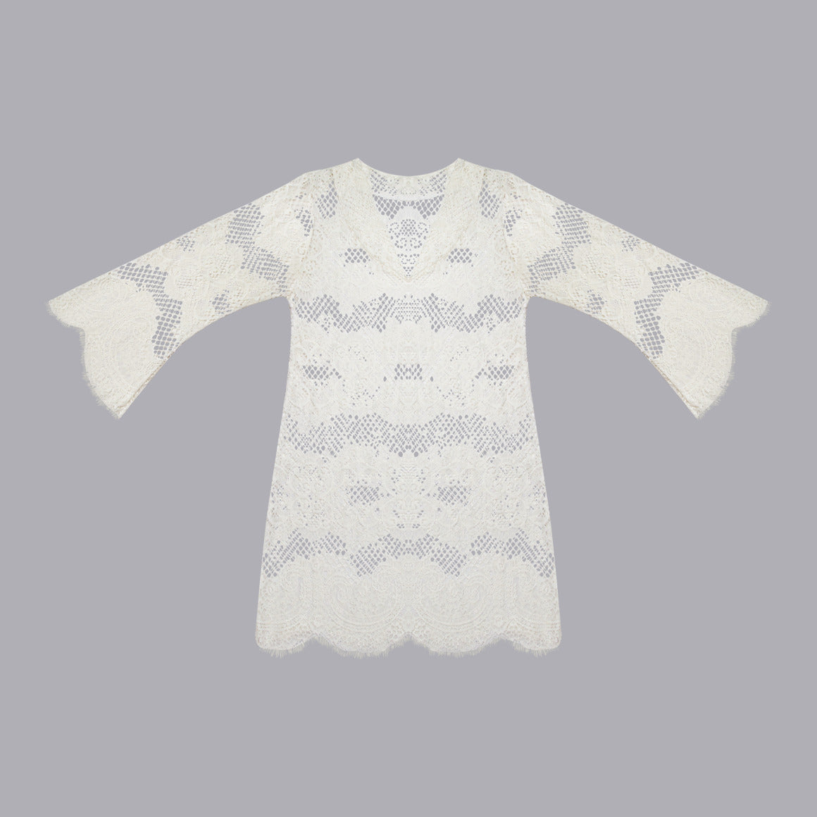 Salida de baño tipo tínica corta, con cuello en v y mangas largas holgadas. elaborado de encaje.