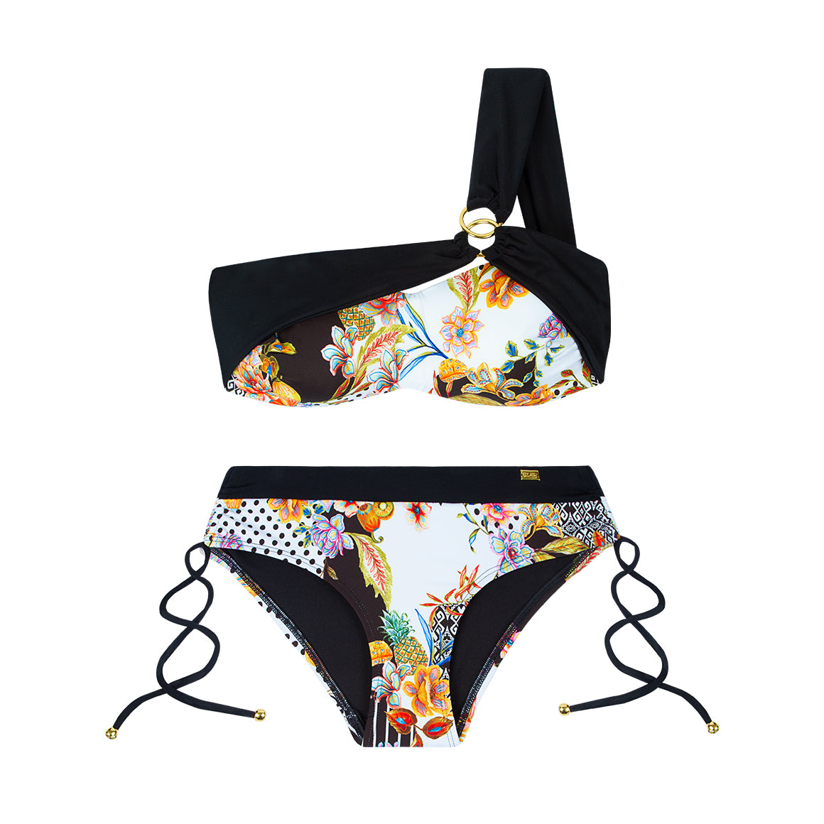 Traje de baño de dos piezas, elaborado de microfibra estampada. top bondeau con tirante a un hombro, copas ligeramente prehormadas, varillas laterales, elastico en espalda y banda para amarrar en la parte posterior. panty con talle medio y cobertura completa, elastico escondido en pierna y cintura para un mejor ajuste, forro de poliester que permite la salida de arena y cordones laterales que ajustan la altura.