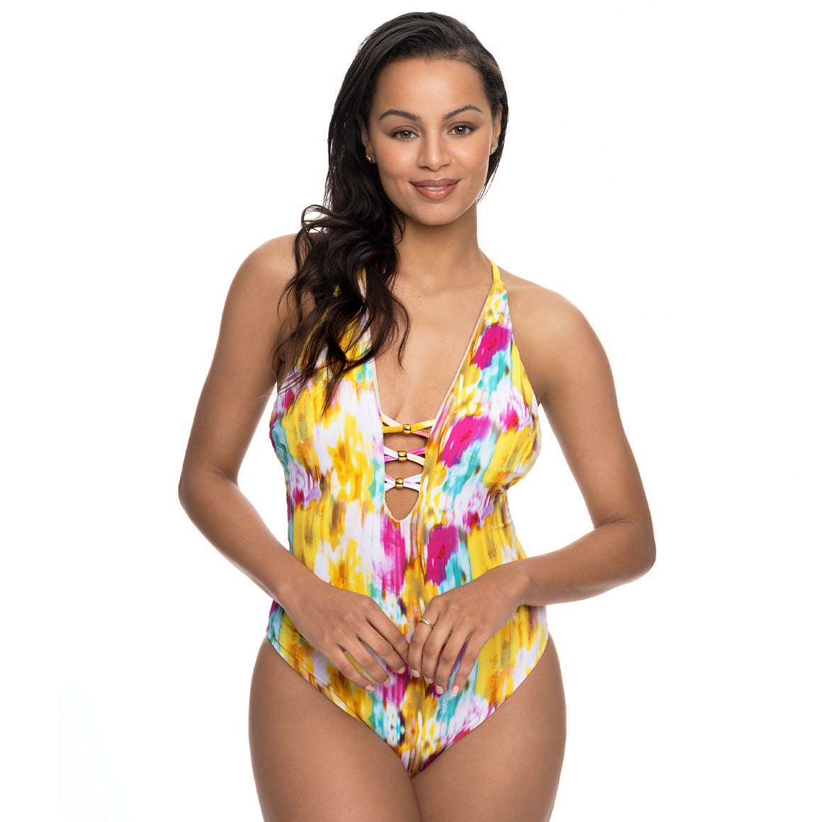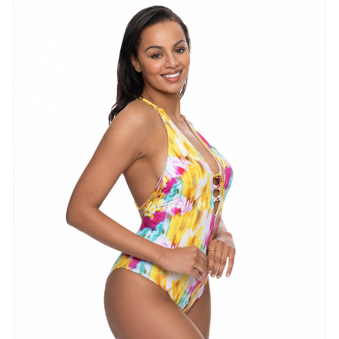 Traje de baño entero con escote profundo y espalda baja en u, cordones que se cruzan en el centro frontal y posterior. copas prehormadas sin realce y removibles. tirantes con cierre de hebilla con cuatro niveles de ajuste en la parte de arriba. cobertura media de la parte posterior del panty. elaborado de microfibra estampada con forro y elástico escondido en los contornos para un mejor ajuste.