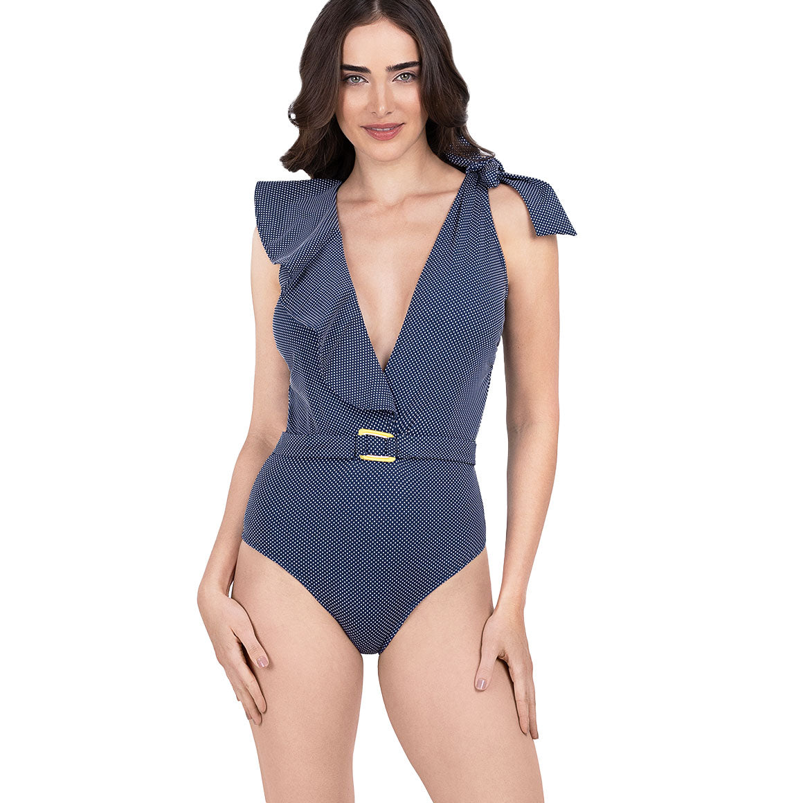 Traje de baño entero, volado en un hombro que va desde el escote frontal hasta la espalda con cordón de amarre en la parte superior y copas prehormadas sin realce y removibles. cobertura media de la parte posterior del panty y escote de pierna alta. elaborado de spandex con textura, forro de poliéster, elástico en los contornos para un mejor ajuste y fajón en la cintura.