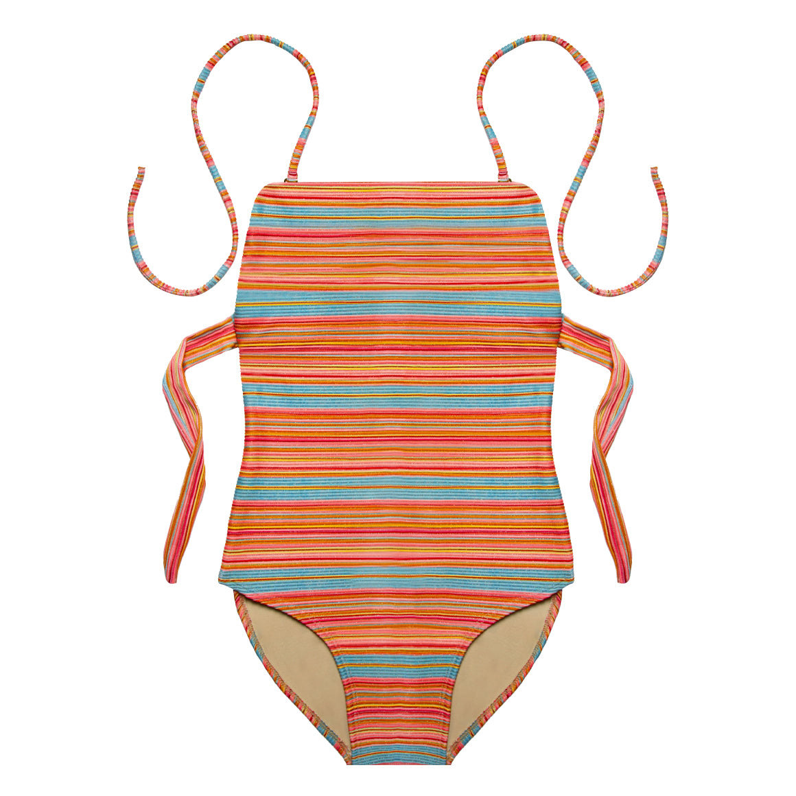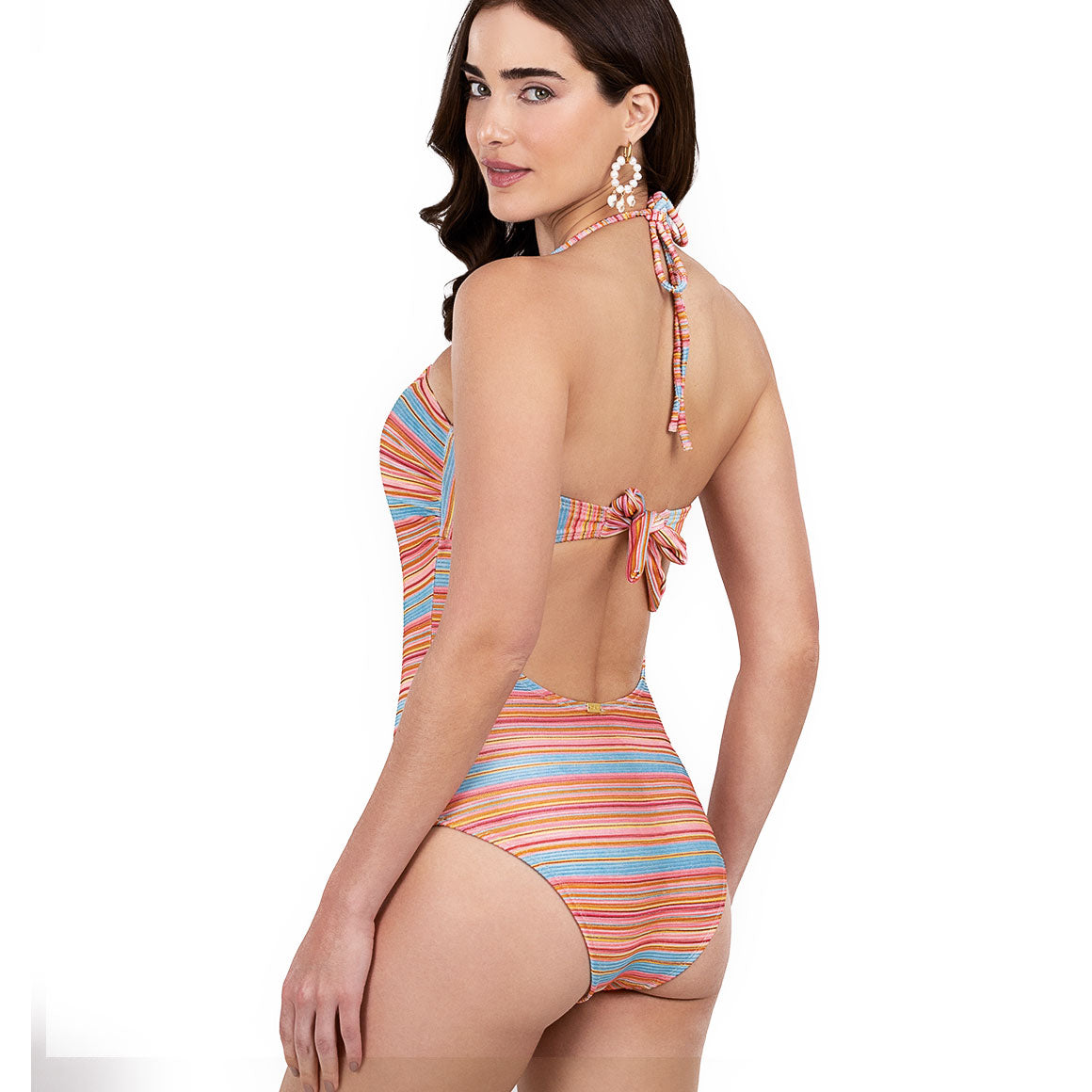 Traje de baño entero, copas prehormadas sin realce, removibles y varillas laterales. tirantes tipo halter y removibles. banda separada en la espalda con cierre de amarre y escote posterior en u. cobertura media de la parte posterior del panty y escote de pierna alta. elaborado de microfibra con textura, elástico en los contornos para un mejor ajuste y forro de poliéster.