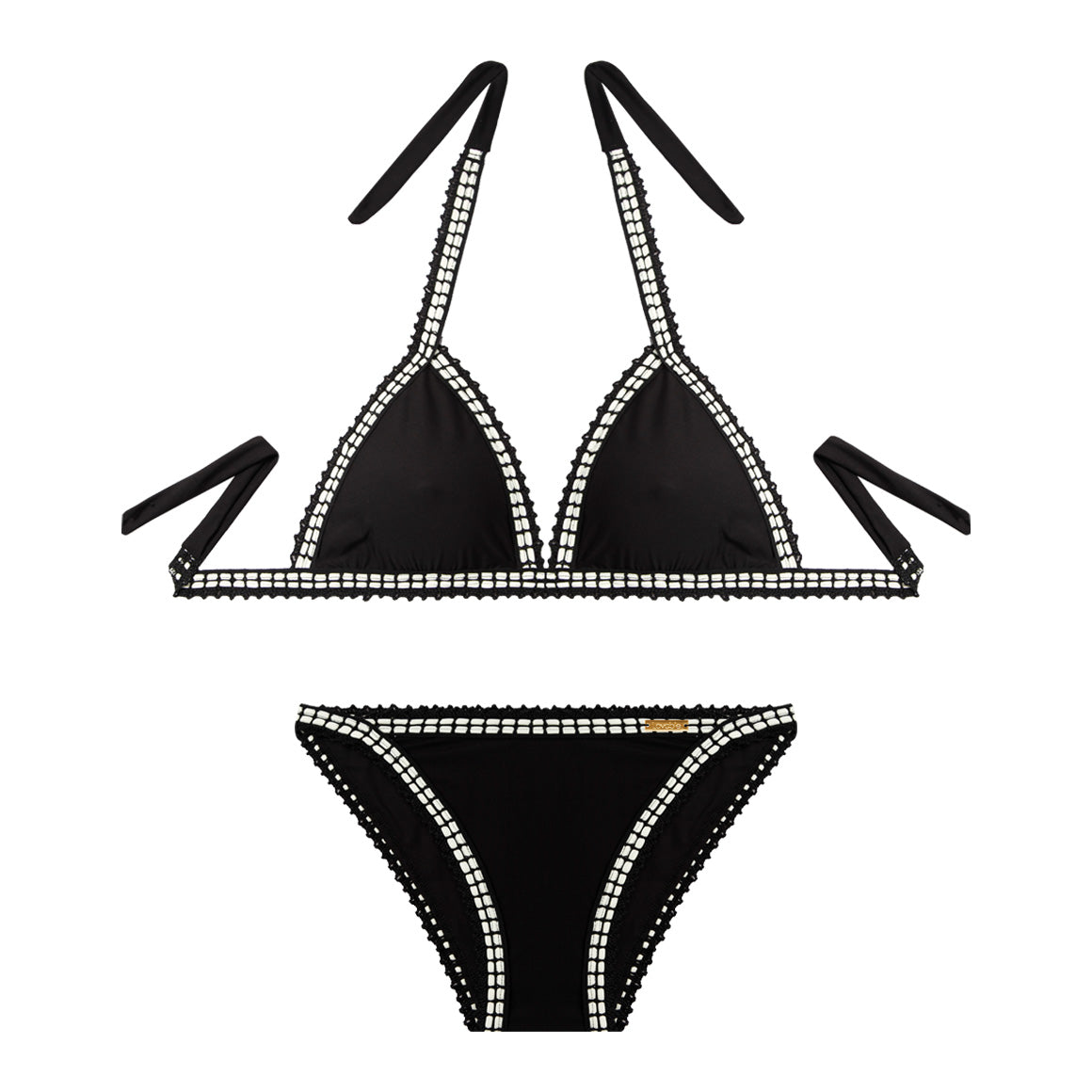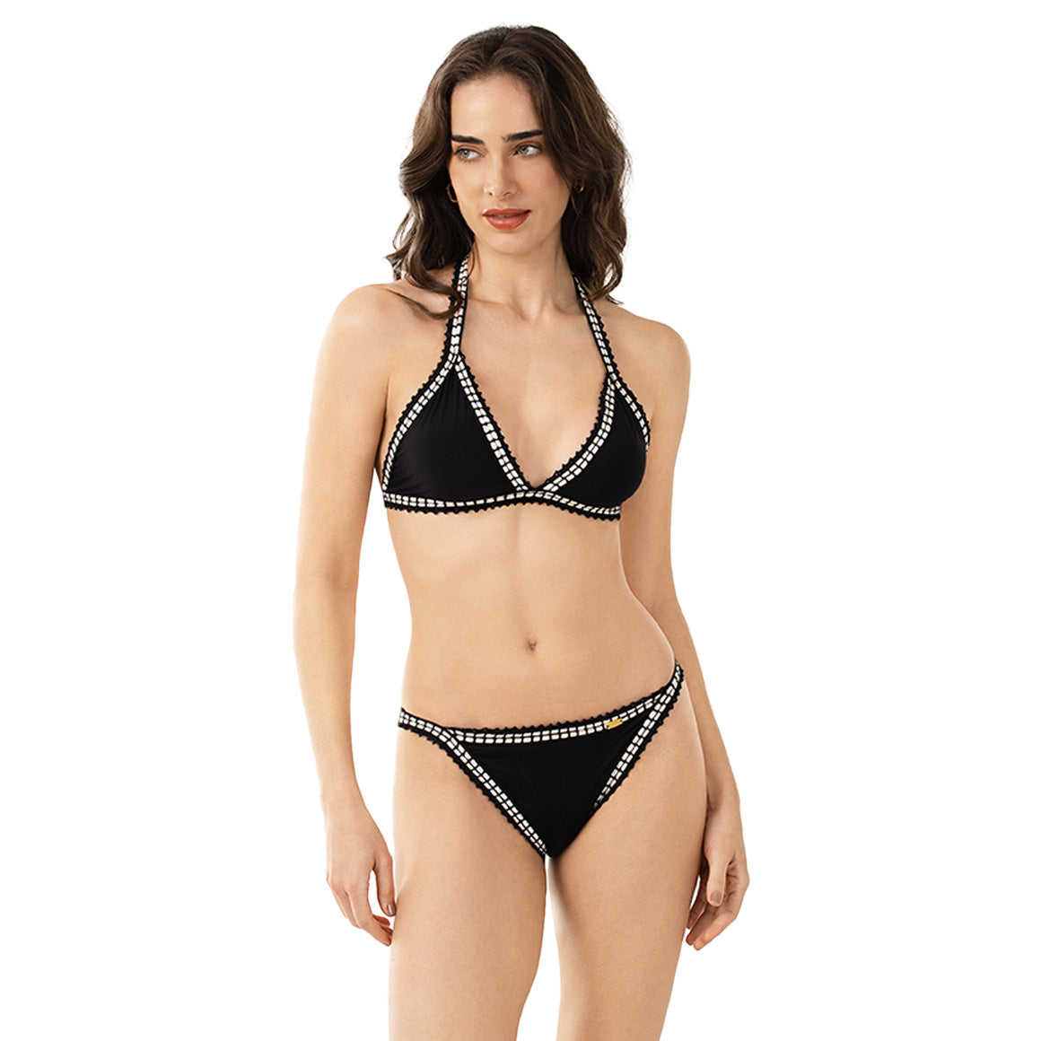 Traje de baño de dos piezas, elaborado de microfibra con forro de poliéster, que ofrece suavidad y flexibilidad. su detalle de elástico bordado en crochet en los contornos aporta un toque artesanal y femenino, garantizando confort y sujeción. top con escote profundo en v y copas triangulares resalta la figura de manera natural, mientras que el tirante tipo halter y la banda posterior con amarre añaden un aire moderno y sofisticado. panty de talle medio, con escote de pierna alta y cobertura media, estiliza la silueta y realza las curvas con elegancia. un conjunto elegante y favorecedor que combina diseño artesanal, ajuste perfecto y estilo contemporáneo.