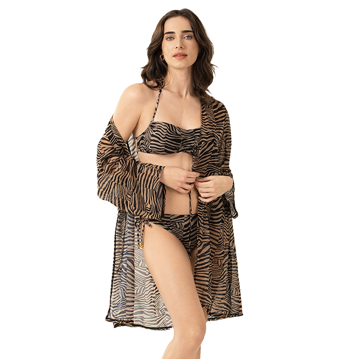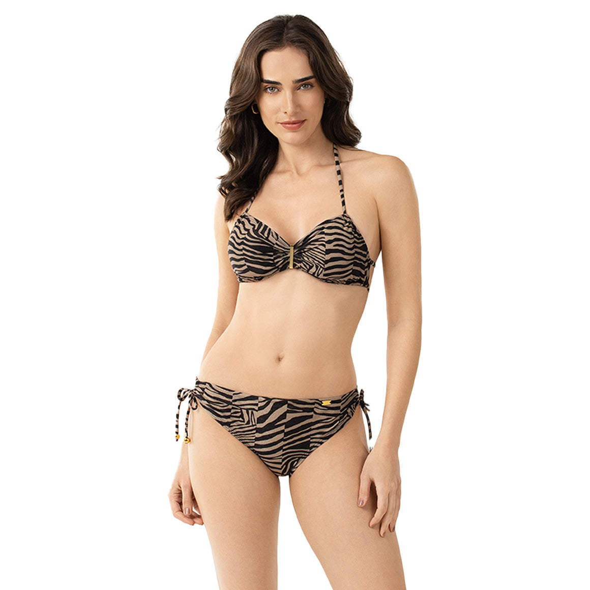 Traje de baño de dos piezas, elaborado de microfibra incluye elástico en los contornos para un mejor ajuste y forro de poliéster que aporta suavidad. top multiusos con tirantes halter cuenta con copas prehormadas sin realce y removibles, un detalle metálico central (removible) te permite llevarlo en dos versiones, cordones de amarre en la espalda y elásticos en los contornos, garantizando soporte, ajuste seguro y comodidad sin comprometer el diseño. panty con talle medio y cobertura media, gracias a los cordones de amarre laterales y el elástico oculto en cintura y piernas, que mantienen la prenda en su lugar con total confort. perfecto para la playa o la piscina, este conjunto combina versatilidad y confort, adaptíndose a tu figura y a diferentes formas de uso.