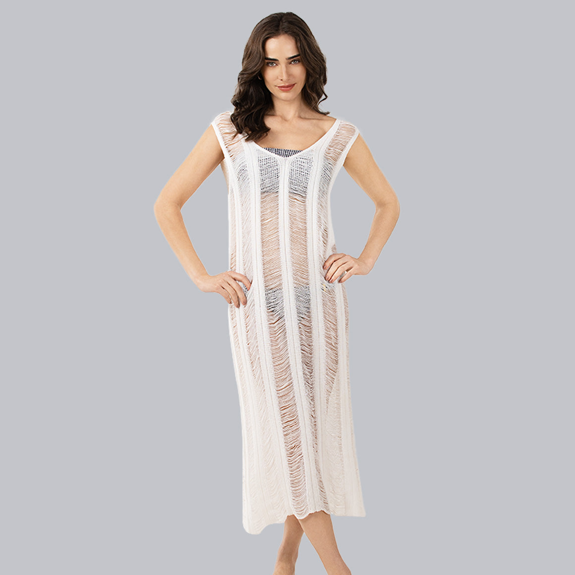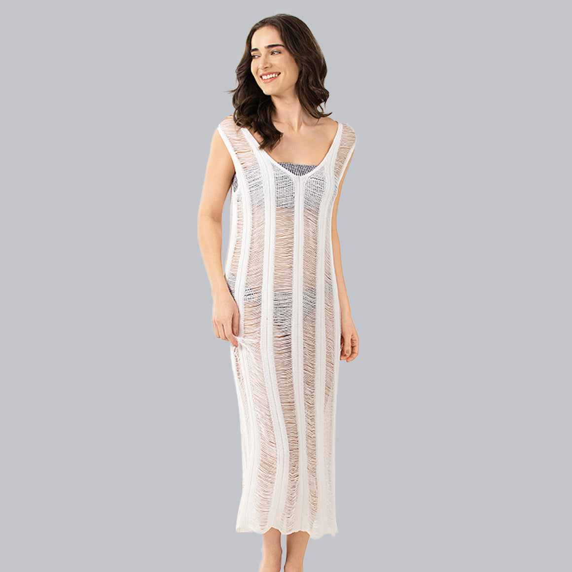 Salida de baño tipo tínica larga, de silueta suelta y fluida que brinda movimiento y comodidad en cada paso. diseñada con cuello v y delicadas tiras holgadas ofrece un estilo relajado y sofisticado, perfecto para tus dñas junto al mar o la piscina. elaborada de crochet combinando textura, ligereza y un toque artesanal, aportando elegancia sin esfuerzo a tu look veraniego.