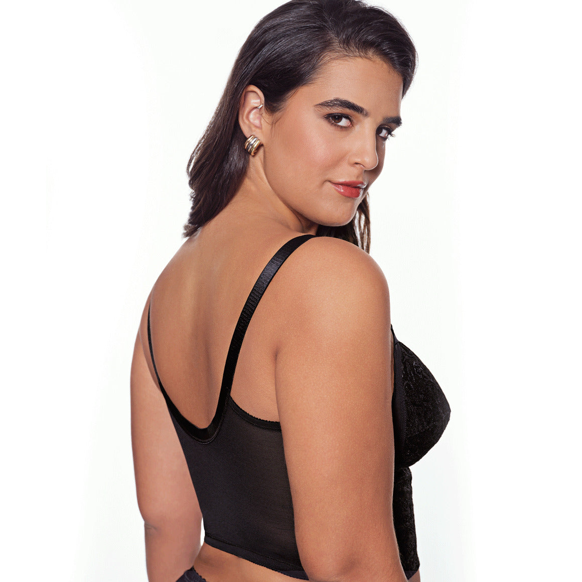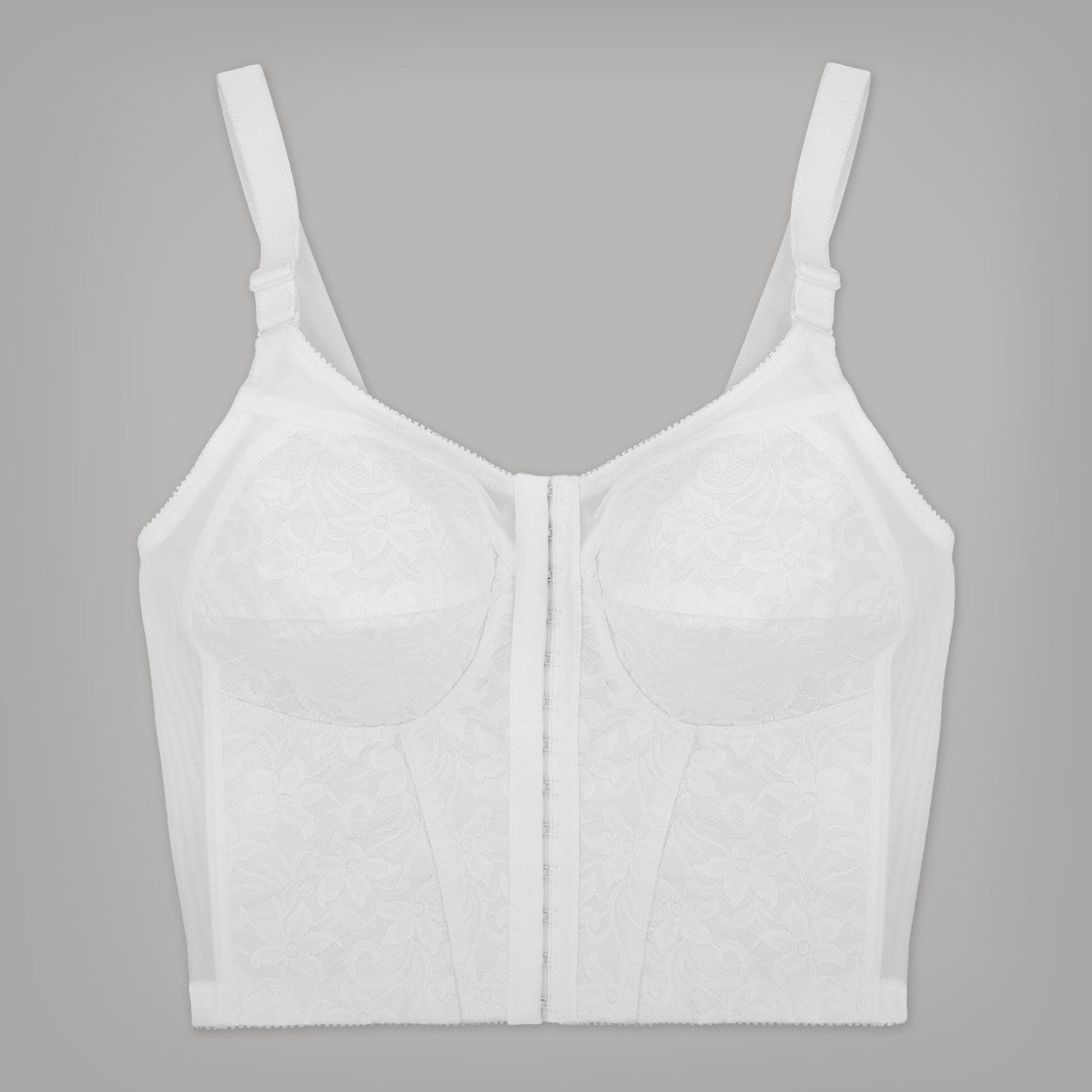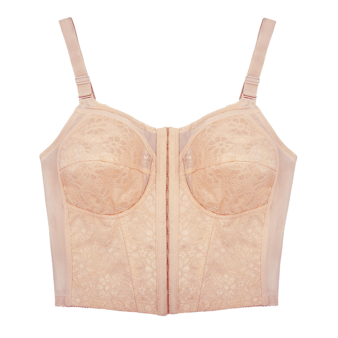 Bustier de banda ancha hasta la cintura, sin aros, copas sin realce con refuerzo. varillas laterales y elástico para un mejor ajuste, broche frontal de 11 (once) ganchos y dos niveles de ajuste, con tirantes anchos regulables. elaborado de powernet y encaje reforzado en la parte frontal. ideal para marcar silueta de la parte superior.