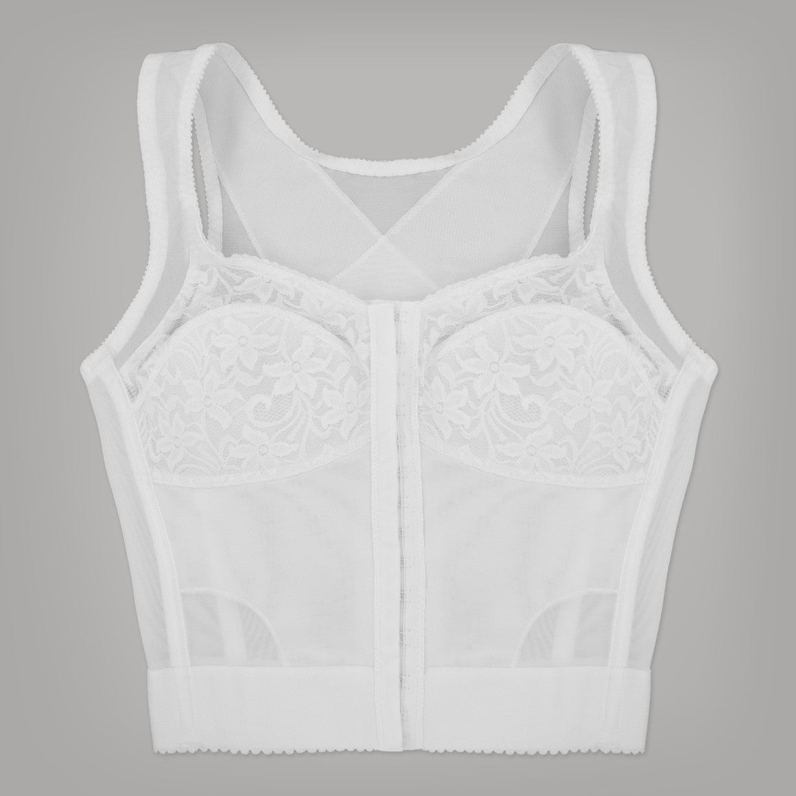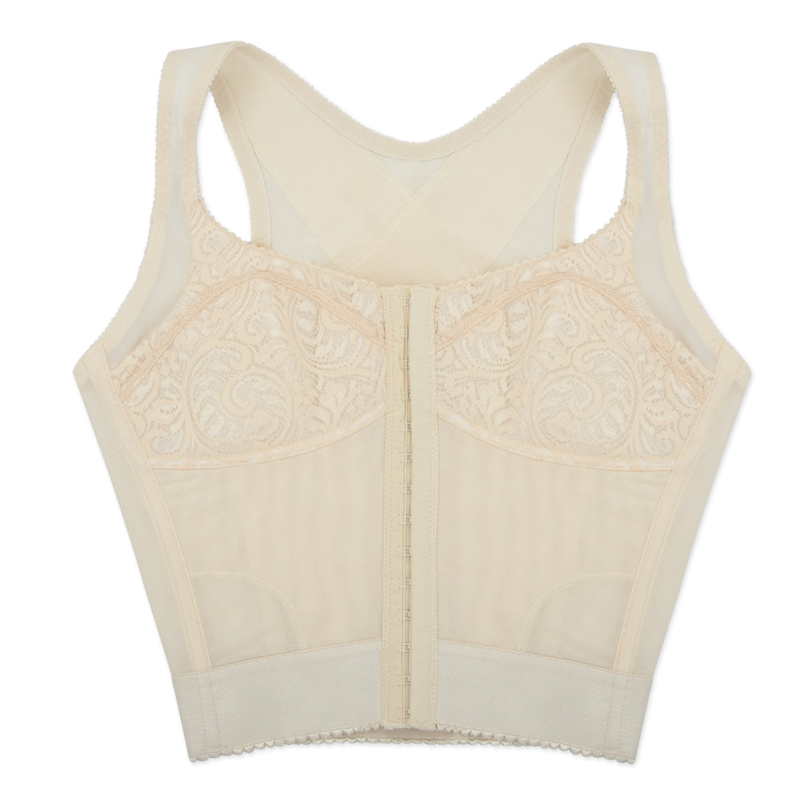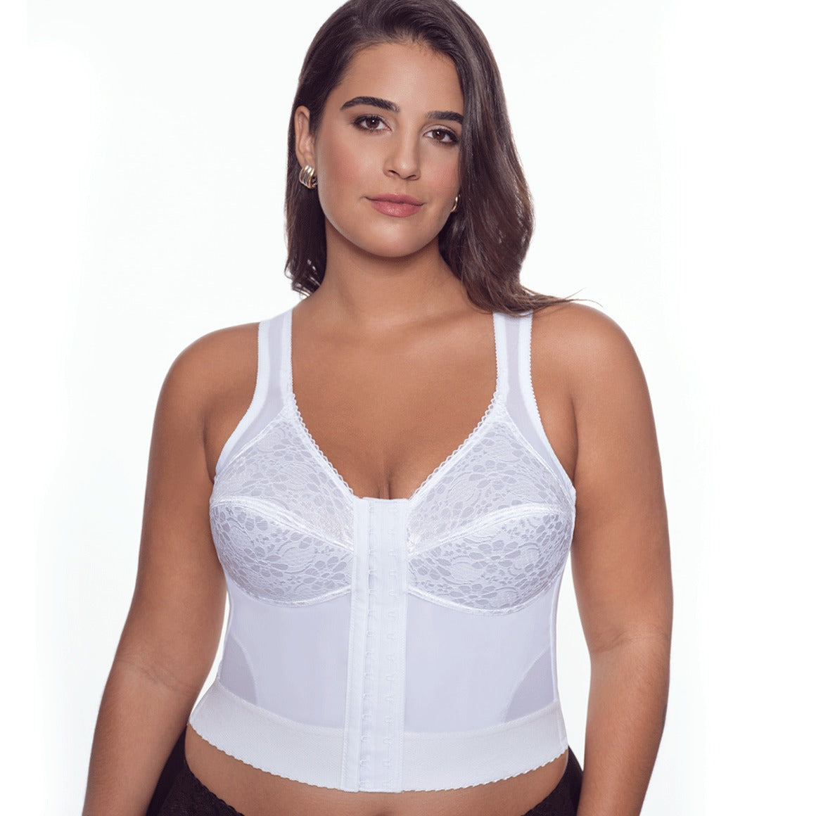 Bustier sin aros, copas sin realce con refuerzo. varillas frontales y posteriores, de banda hasta la cintura con elástico para un mejor ajuste. broche frontal de 14 (catorce) ganchos y dos niveles de ajuste, con tirantes anchos. elaborado de powernet, y copas de encaje. ideal para corregir la postura, por su soporte y refuerzo en la espalda en x.
