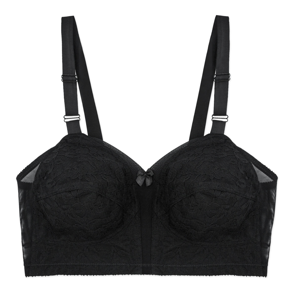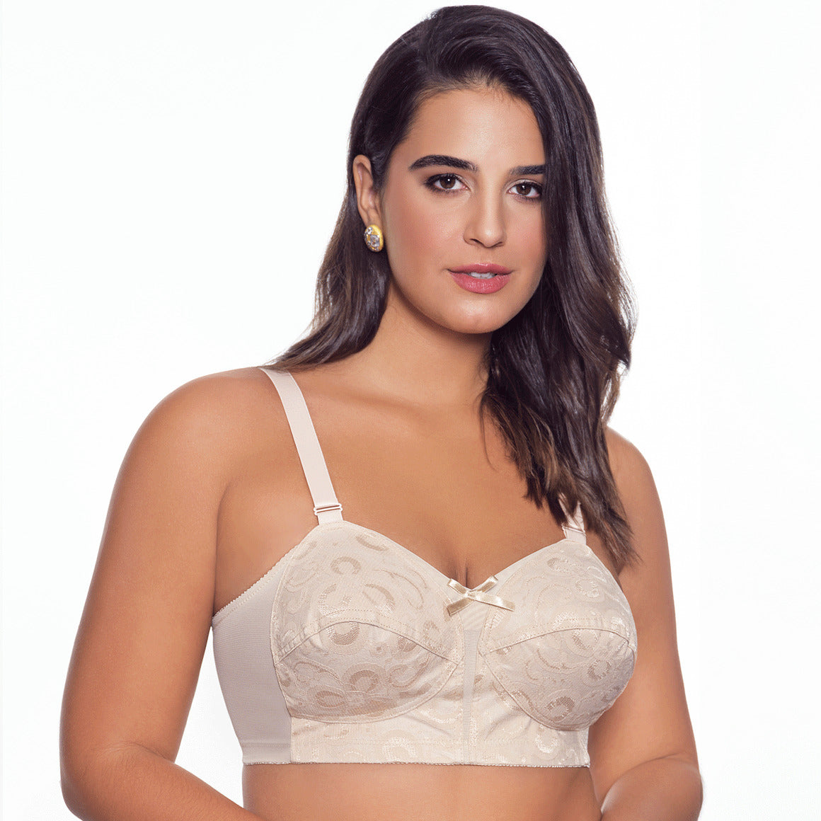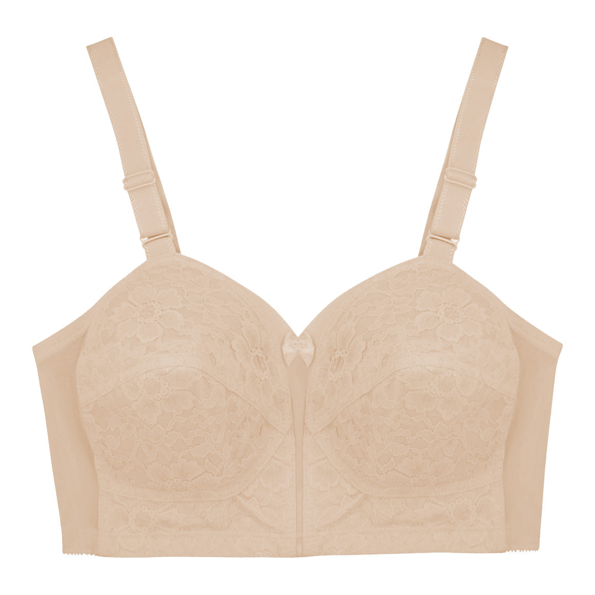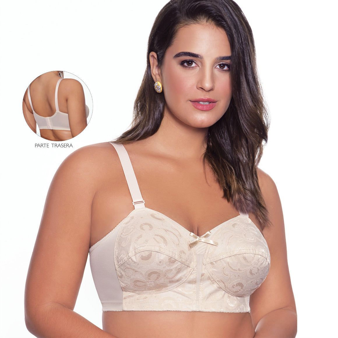 Brasier sin aros, copas sin realce con refuerzo. banda ancha con elástico para un mejor ajuste. broche de cuatro ganchos y tres niveles de ajuste, con tirantes anchos regulables. elaborado de powernet, encaje en copas y parte frontal de banda.