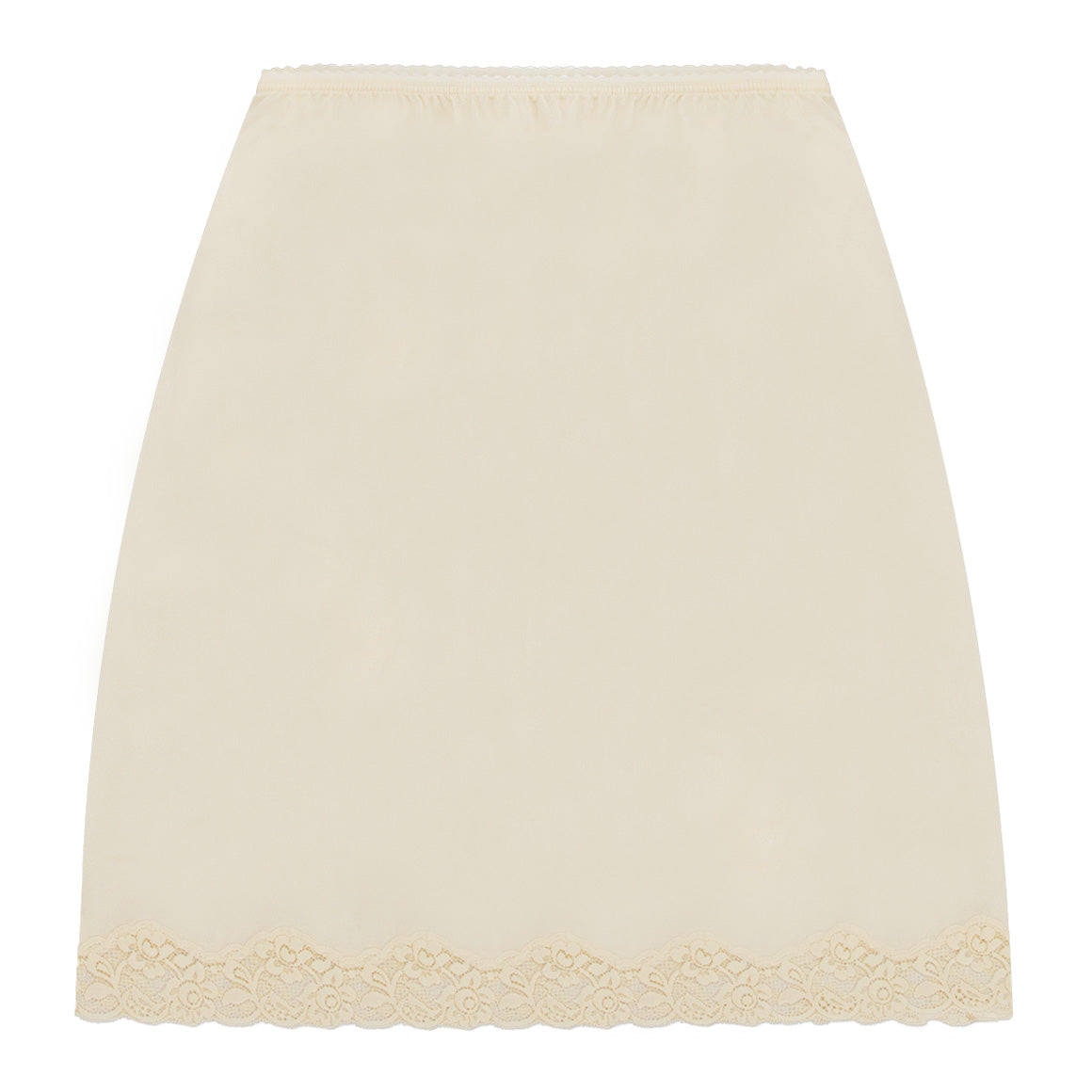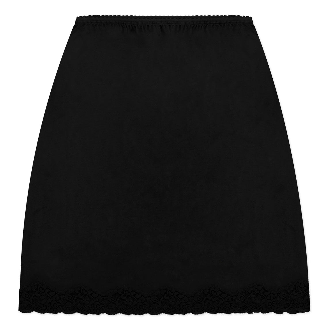Saya tipo falda con talle alto. elaborado de nylon, elástico en cintura para un mejor ajuste y con detalles de encaje en el ruedo.
