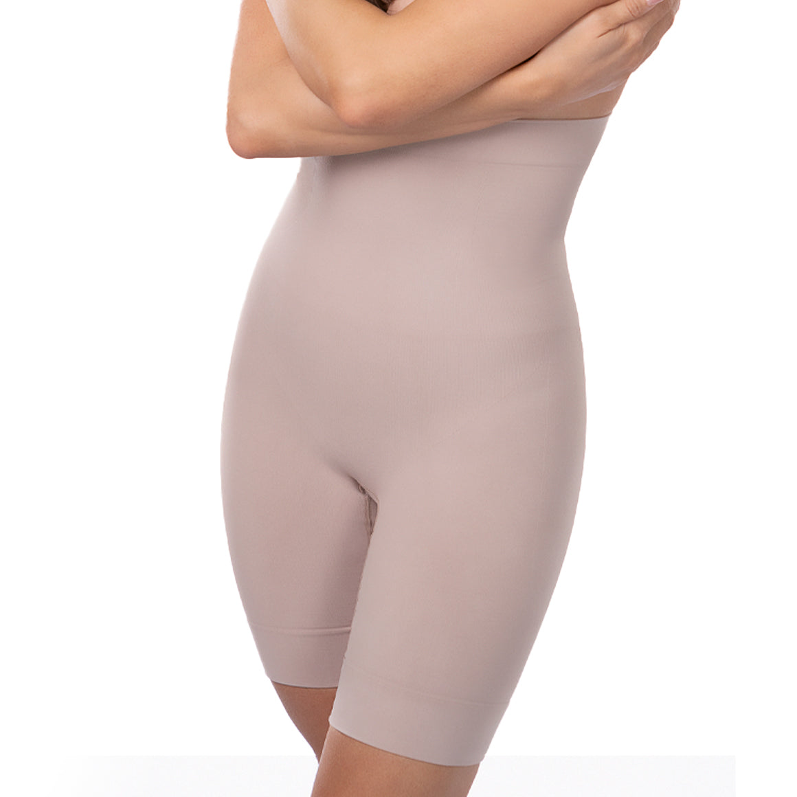 Faja con control fuerte, sin costuras en los laterales, con talle abajo del busto y cobertura hasta media pierna. elaborado de microfibra, cuenta con una abertura inferior para mayor comodidad. con silicon antideslizante en la banda superior.