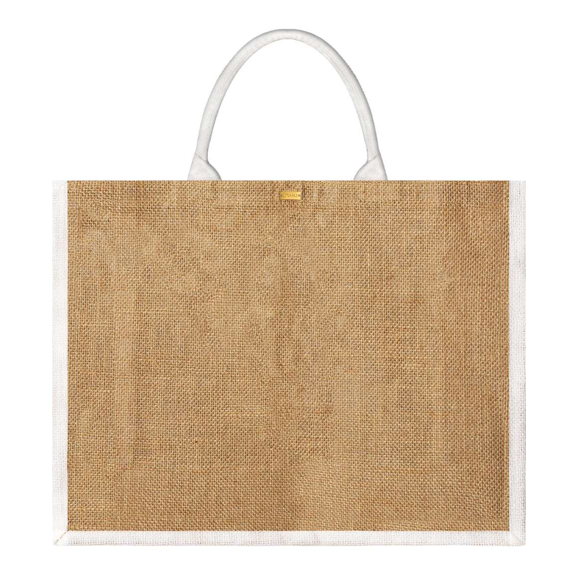Bolso reusable grande. elaborado de fibra de yute natural. tiene costuras en la parte inferior y laterales. las correas son suaves y están cosidas al bolso. el interior tiene un revestimiento resistente al agua. su diseño versátil hace que sea perfecto para el día a día. tamaño: 16 ½*13 *6 pulg